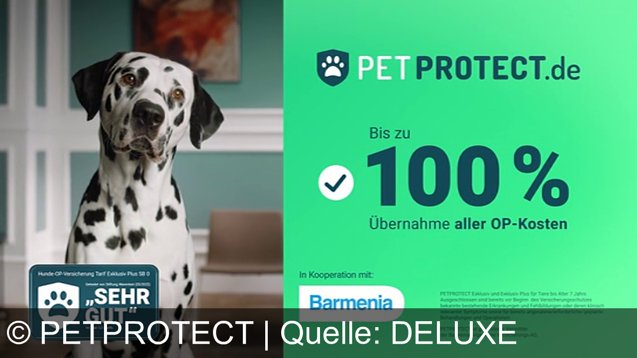 Ein Dalmatiner schaut nach links. Rechts im Bild grüner Hintergrund mit dem Text "PETPROTECT.de", "Bis zu 100%", "Übernahme aller OP-Kosten". Unten links ein Logo mit "SEHR GUT". Kooperation mit "Barmenia". Im Hintergrund ist ein Bild an der Wand und ein Stuhl.