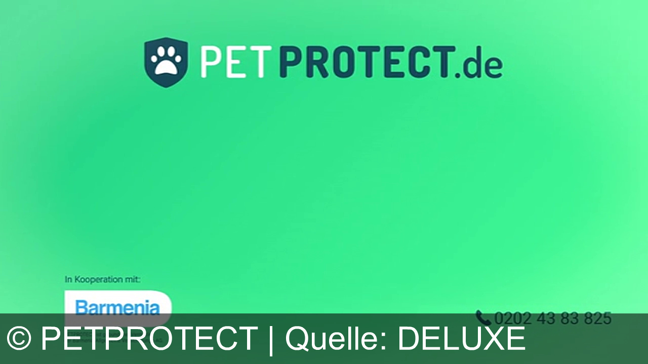 Grüner Hintergrund, oben steht "PETPROTECT.de" mit einem Pfoten-Logo. Unten links ist das Barmenia-Logo mit dem Hinweis "In Kooperation mit". Rechts unten eine Telefonnummer: 0202 43 83 825.