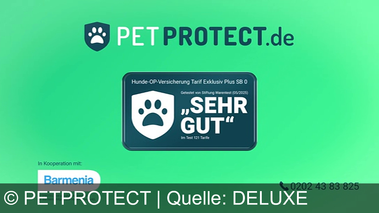 Ein grüner Hintergrund mit dem Logo PETPROTECT.de. Ein Schild zeigt eine Pfote und den Text "Hunde-OP-Versicherung Tarif Exklusiv Plus SB 0". Bewertet mit "Sehr gut" von Stiftung Warentest. Unten links das Logo von Barmenia. Telefonnummer 0202 43 83 825.