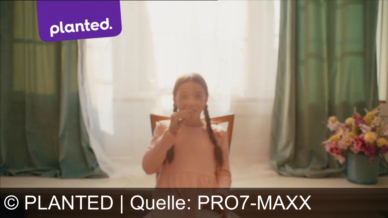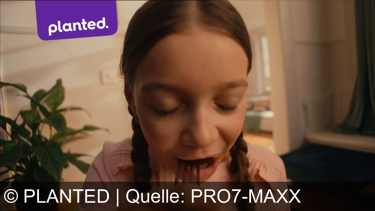 Ein Mädchen mit Zöpfen isst mit einer Gabel. Im Hintergrund sind Pflanzen und ein Zimmer zu sehen. Oben links befindet sich ein lila Logo mit der Aufschrift "planted.".