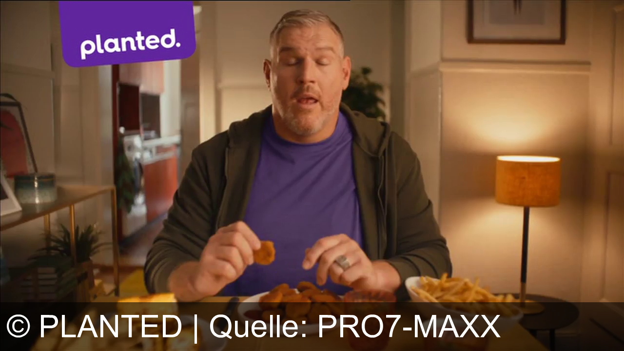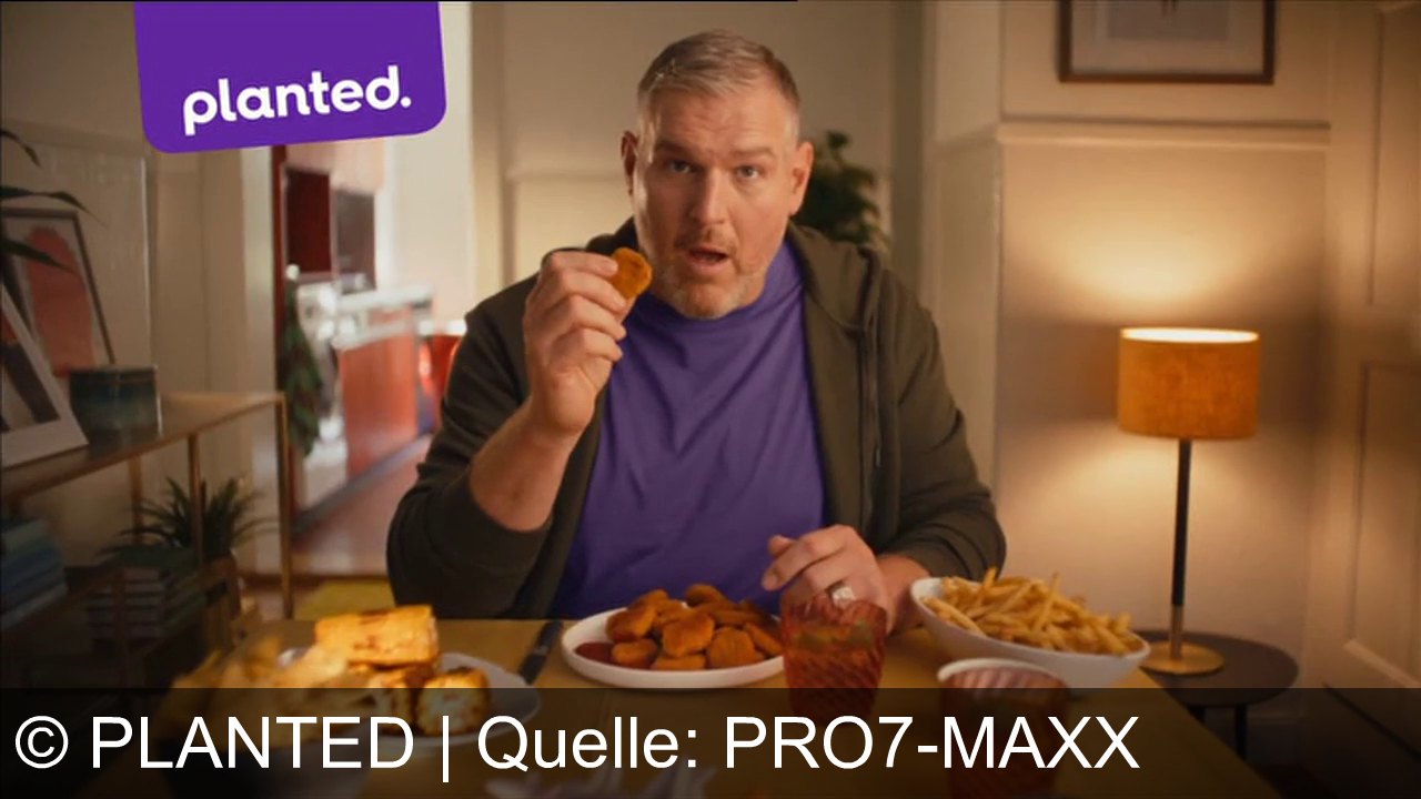Ein Mann sitzt an einem Tisch mit Pommes, Nuggets und gefüllten Teigtaschen. Er hält ein Nugget in der Hand. Zwei Gläser stehen auf dem Tisch. Im Hintergrund ein gedimmtes Licht und einige Bilder. Oben links ein lila Logo mit der Aufschrift "planted."