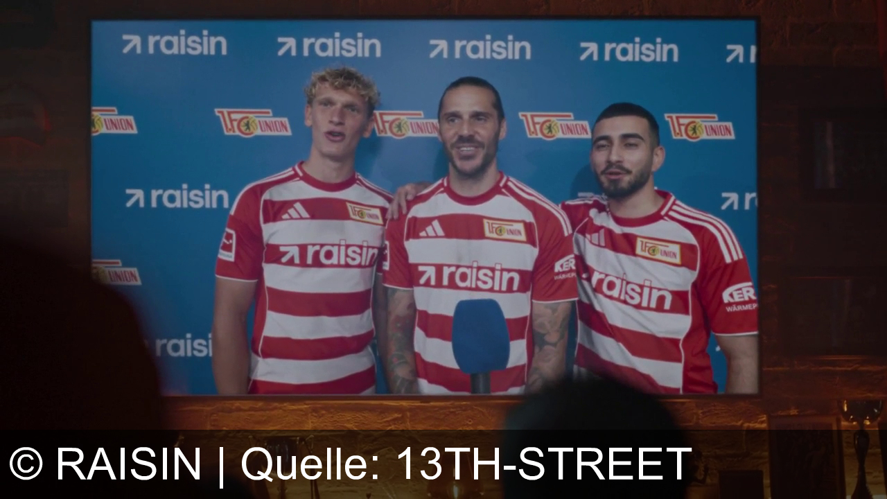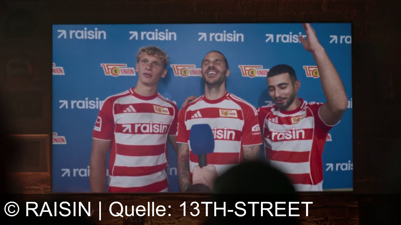 Drei Männer in Fußballtrikots mit roten und weißen Streifen stehen vor einer blauen Wand mit Logos von "raisin" und "1. FC Union". Einer hält ein Mikrofon, sie lächeln. Im Vordergrund unscharfe Silhouetten von Zuschauern.
