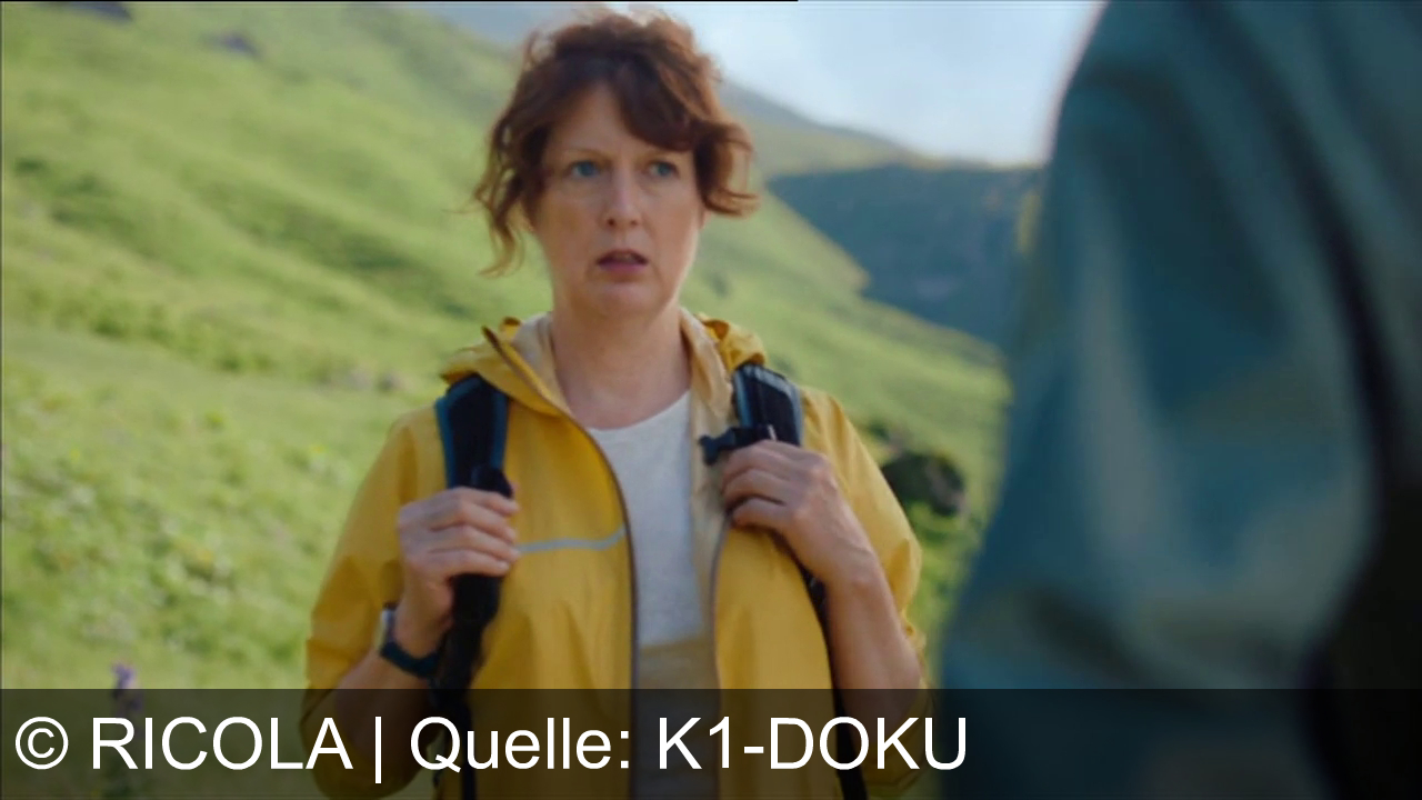 Eine Frau mit gelber Jacke und Rucksack steht in einer grünen Hügellandschaft. Sie schaut leicht besorgt oder überrascht. Der Himmel ist klar.
