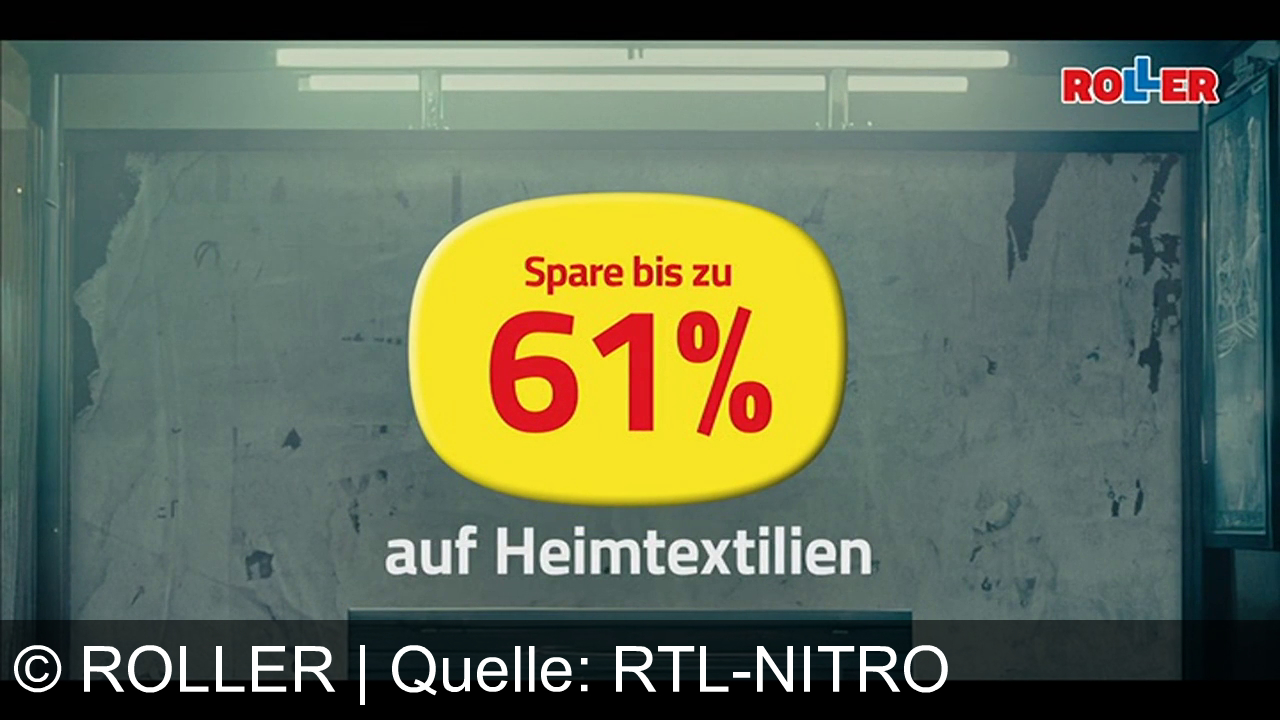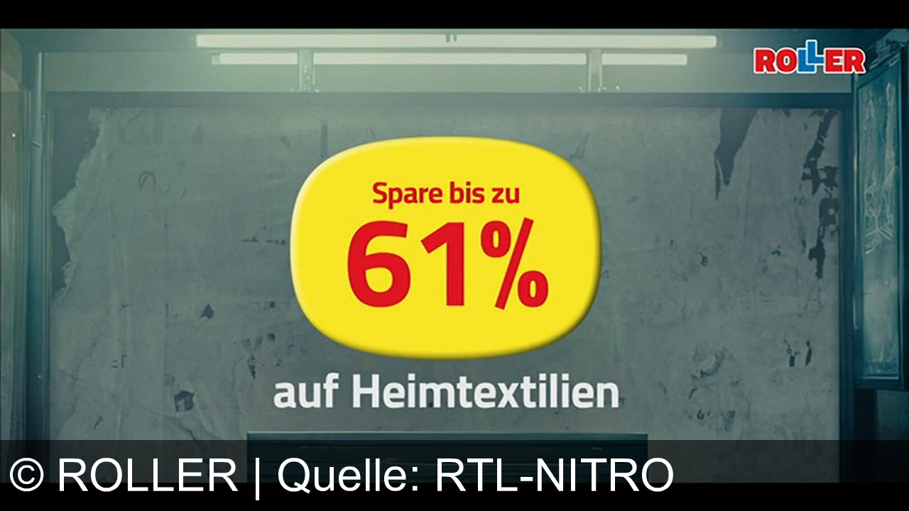 Gelbes Schild mit rotem Text: "Spare bis zu 61%" über "auf Heimtextilien". Oben rechts das Logo "ROLLER" in Rot-Blau. Grauer Hintergrund mit leichter Abnutzung und Beleuchtung von oben.