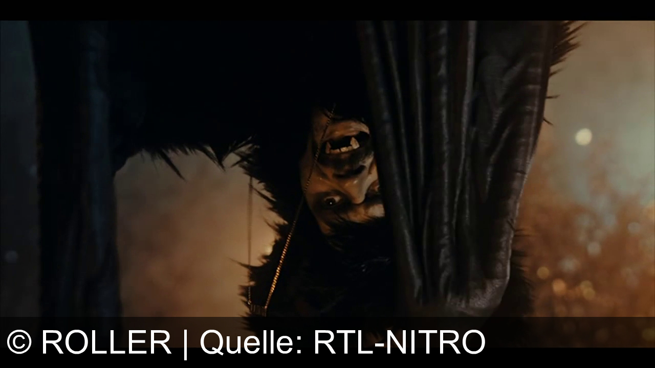 Eine Gestalt mit großen Zähnen hängt kopfüber, umgeben von Federn oder Fell. Ein Metallstück verläuft über das Gesicht. Im Hintergrund ein unscharfer, orangefarbener Schein.