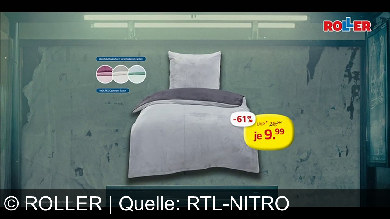 Werbung aus dem Jahr 2025 von Roller in Deutschland, mit dem von uns gewählten Titel: "ROLLER: Wendebettwäsche schon ab 9,99 € und bis zu 61 % Rabatt auf Heimtextilien sichern" mit der Kurzbeschreibung: "Erschreckend günstige Heimtextilien bei Roller: Spare bis zu 61 % und sichere dir Wendebettwäsche ab 9,99 € – jetzt inspirierende Angebote entdecken!". Diese Werbung thematisiert oder beinhaltet die Kategorie/n Bettwäsche, Rabatt, Kissen.
