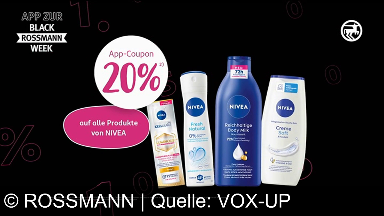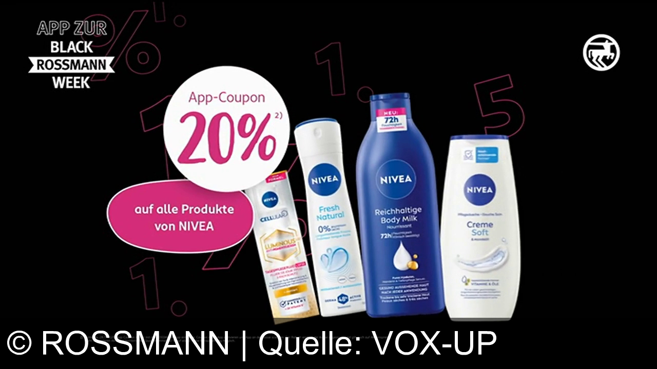 Werbung aus dem Jahr 2025 von Rossmann in Deutschland, mit dem von uns gewählten Titel: "Mehr sparen mit der Rossmann-App: 20 % auf NIVEA und e.l.f.-Angebote zur Black Rossmann Week" mit der Kurzbeschreibung: "Sichere dir mit der Rossmann-App starke Rabatte zur Black Rossmann Week: 20% auf alle Nivea Produkte und 2+1 gratis auf e.l.f. – entdecke noch mehr Angebote exklusiv in der App!". Diese Werbung thematisiert oder beinhaltet die Kategorie/n Bodylotion, Deo, Duschgel, Make-Up, Kosmetik, Apps, Rabatt.