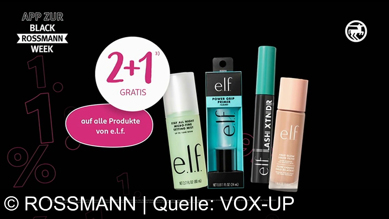 Vier e.l.f.-Produkte nebeneinander auf schwarzem Hintergrund. Links ein Kreis mit "2+1 Gratis" und "auf alle Produkte von e.l.f.". Oben links "App zur Black Rossmann Week". Rechts oben ein Rossmann-Logo. Verschiedene Prozentzeichen im Hintergrund.