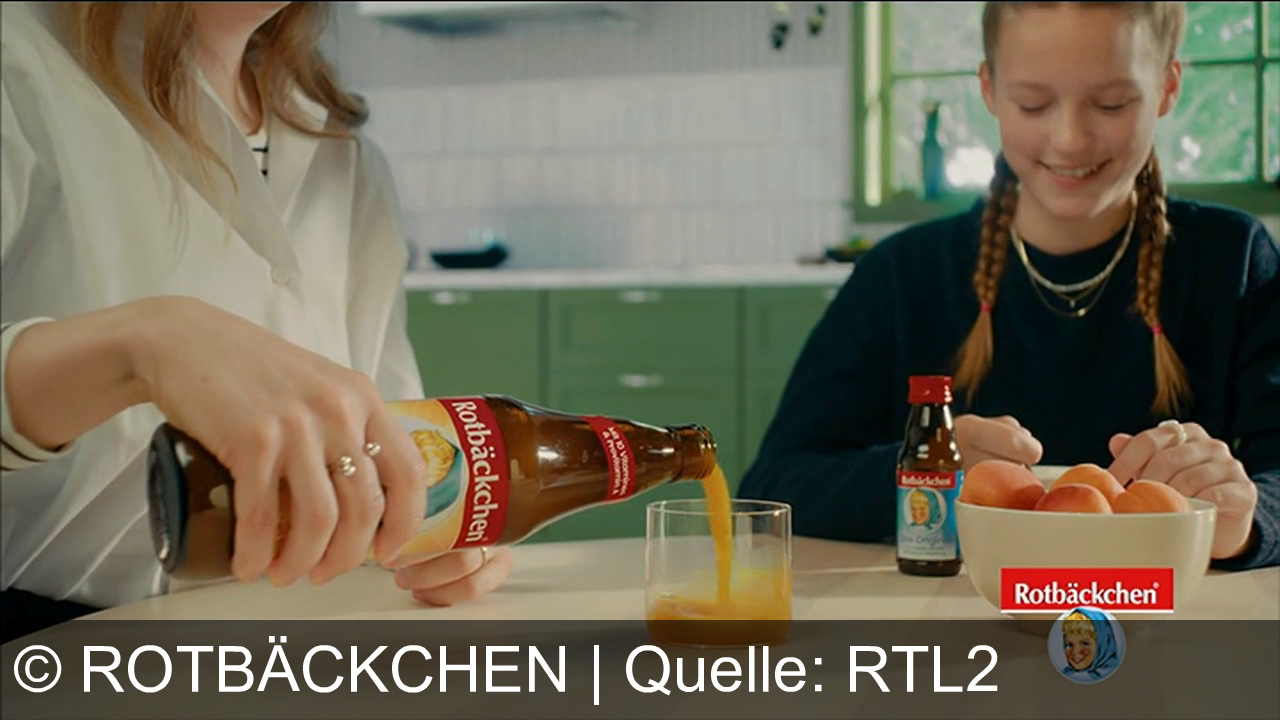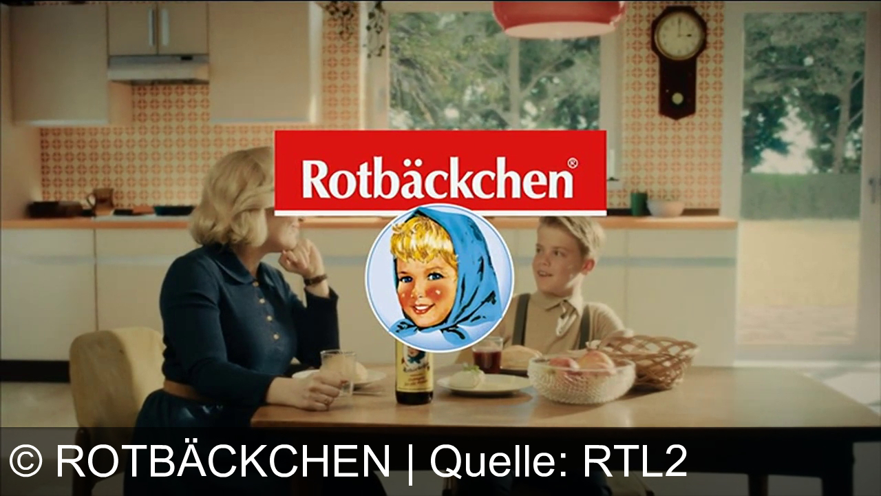 In einer Küche sitzen eine Frau und ein Kind an einem Tisch. Auf dem Tisch stehen eine Flasche mit Rotbäckchen-Saft und Gläser. Eine Schale mit Obst ist zu sehen. An der Wand hängt eine Uhr. Das logo "Rotbäckchen" ist in der Mitte des Bildes eingeblendet.