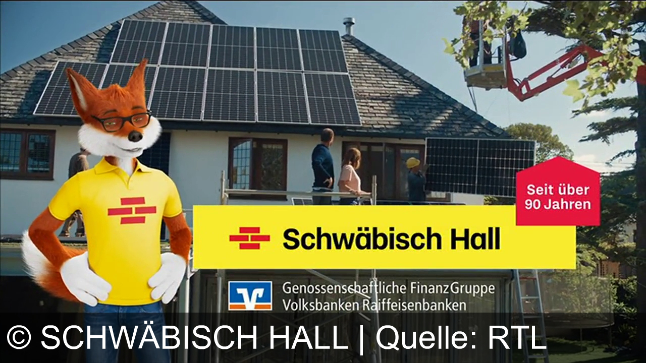 Ein anthropomorpher Fuchs trägt ein gelbes Polohemd mit einem Logo. Im Hintergrund ein Haus mit Solarpaneelen auf dem Dach. Zwei Personen schauen zu, wie ein Arbeiter in einem Hebekorb ein Solarpanel installiert. Schriftzug "Schwäbisch Hall" auf gelbem Hintergrund. Logo von Genossenschaftlicher FinanzGruppe Volksbanken Raiffeisenbanken.