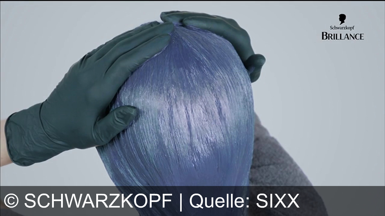 Zwei Hände in grünen Handschuhen halten einen Kopf mit violett gefärbtem Haar. Oben rechts steht "Schwarzkopf Brillance".