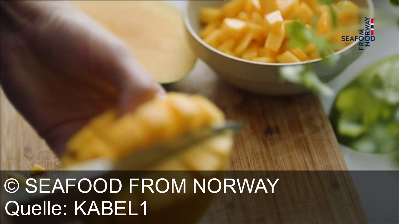 Eine Hand schneidet eine Mango auf einem Holzbrett. Im Hintergrund steht eine Schale mit bereits gewürfelter Mango. Rechts erkennt man ein Logo mit der Aufschrift "Seafood from Norway". Ein paar grüne Blätter sind unscharf im Vordergrund zu sehen.