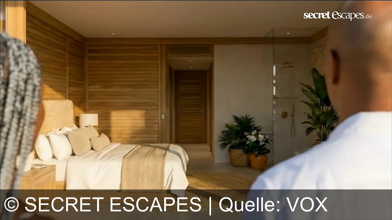 Ein luxuriöses Schlafzimmer mit einem großen Bett, weißen Kissen und einem beigen Überwurf. Holzwände und eine Glastür führen zu einem modernen Badezimmer. Pflanzen dekorieren den Raum. Kräfte in Vordergrund, Logo von secreteescapes.de oben rechts.