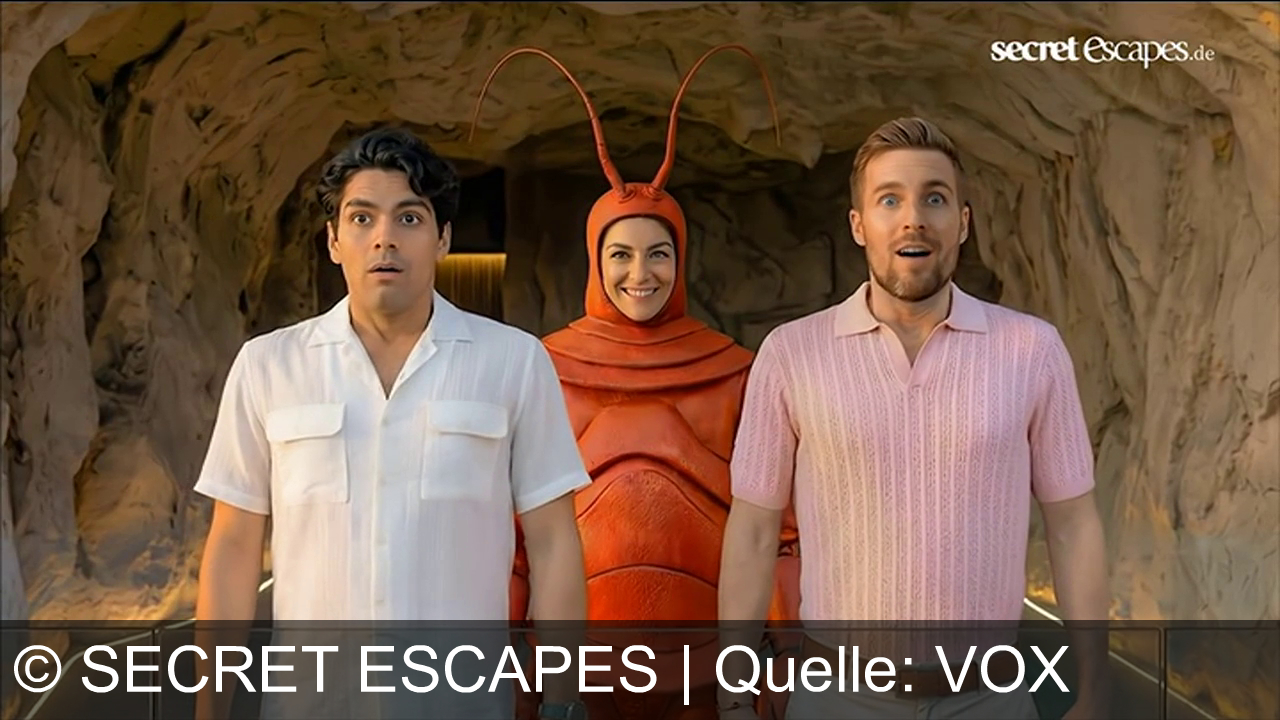 Drei Personen in einer Höhle. Zwei Männer vorne, einer in weißem Hemd, der andere in rosa Polo-Shirt. Beide schauen erstaunt. Dahinter eine Frau im roten Kostüm mit Fühlern, die lächelt. Oben rechts steht "secret escapes.de".