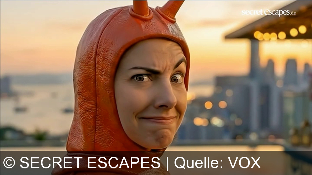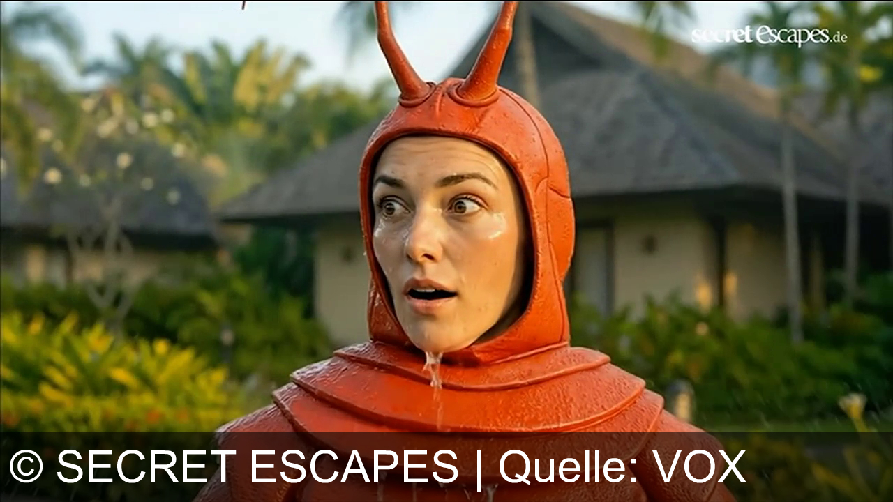 Eine Person in einem roten Hummerkostüm steht im Freien, der Mund leicht geöffnet. Im Hintergrund sind tropische Pflanzen und ein Haus mit Strohdach zu sehen. Die Person hat einen erstaunten Ausdruck, Wasser läuft ihr vom Gesicht. In der oberen rechten Ecke ist das Logo "secretescapes.de" zu sehen.