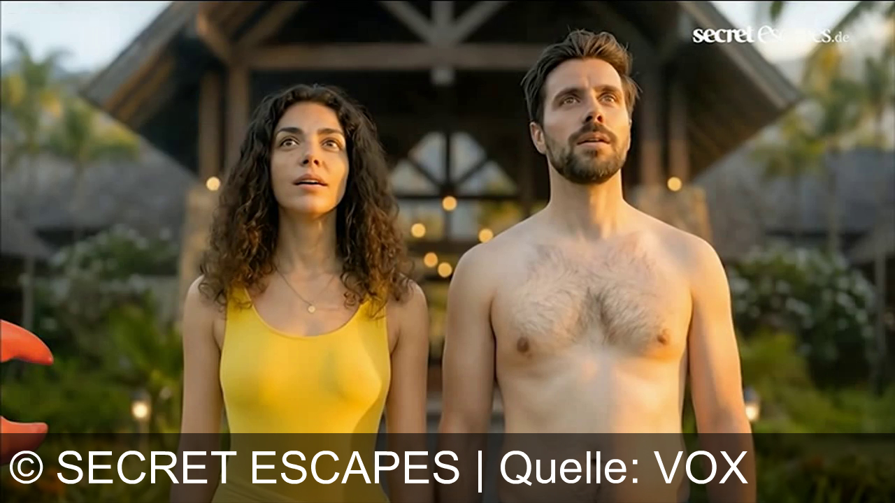 Ein Mann mit blauen Shorts und eine Frau im gelben Badeanzug stehen nebeneinander, schauen beeindruckt in die Ferne. Im Hintergrund ein Gebäude mit offenem Eingang, umgeben von grüner Vegetation. "Secret escapes.de" steht oben rechts auf dem Bild.