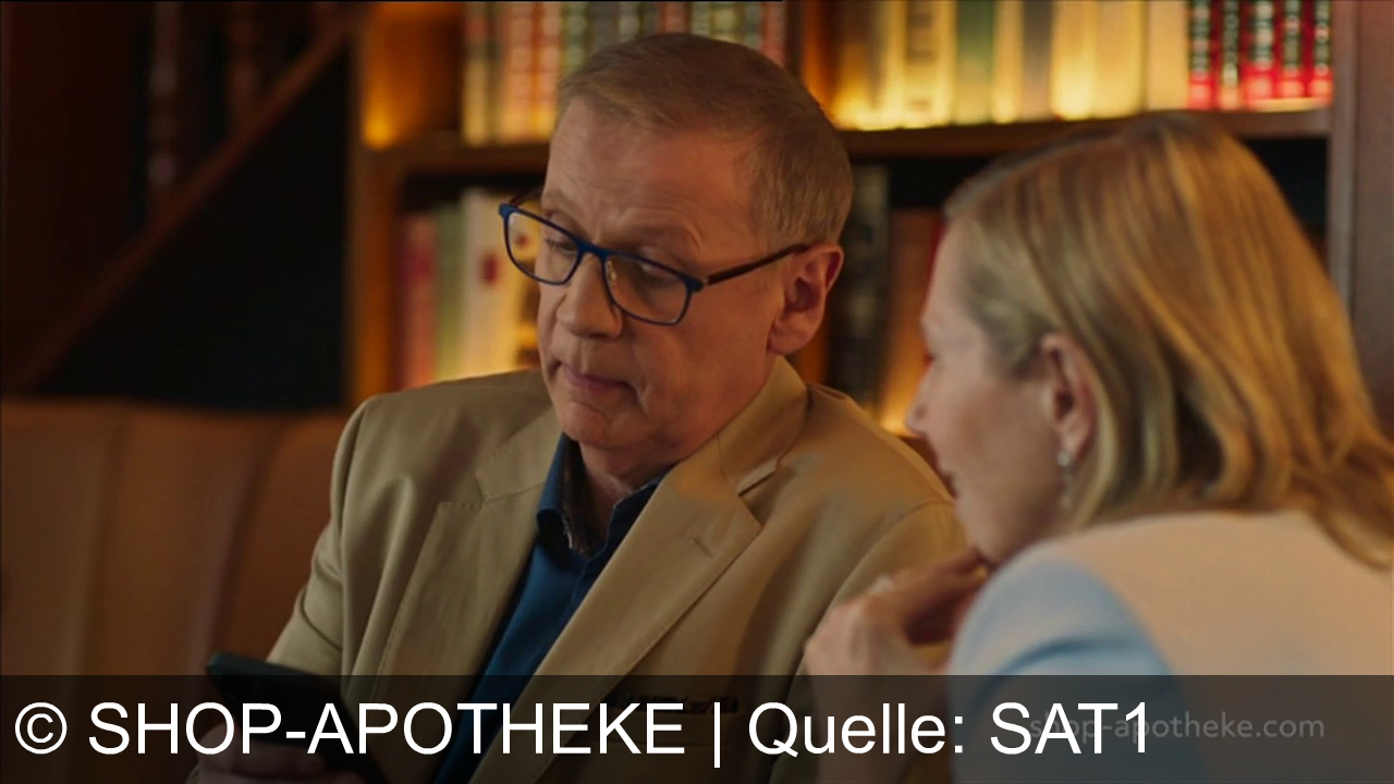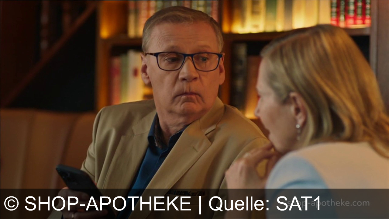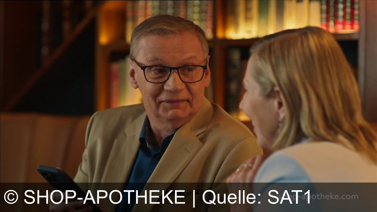 Zwei Personen sitzen vor einem Bücherregal, wahrscheinlich in einem Wohnzimmer oder einer Bibliothek. Der Mann trägt eine Brille und ein beiges Sakko, schaut auf ein Smartphone. Rechts im Bild eine Frau mit blonden Haaren im hellblauen Oberteil. Unten rechts der Schriftzug „shop-apotheke.com“.