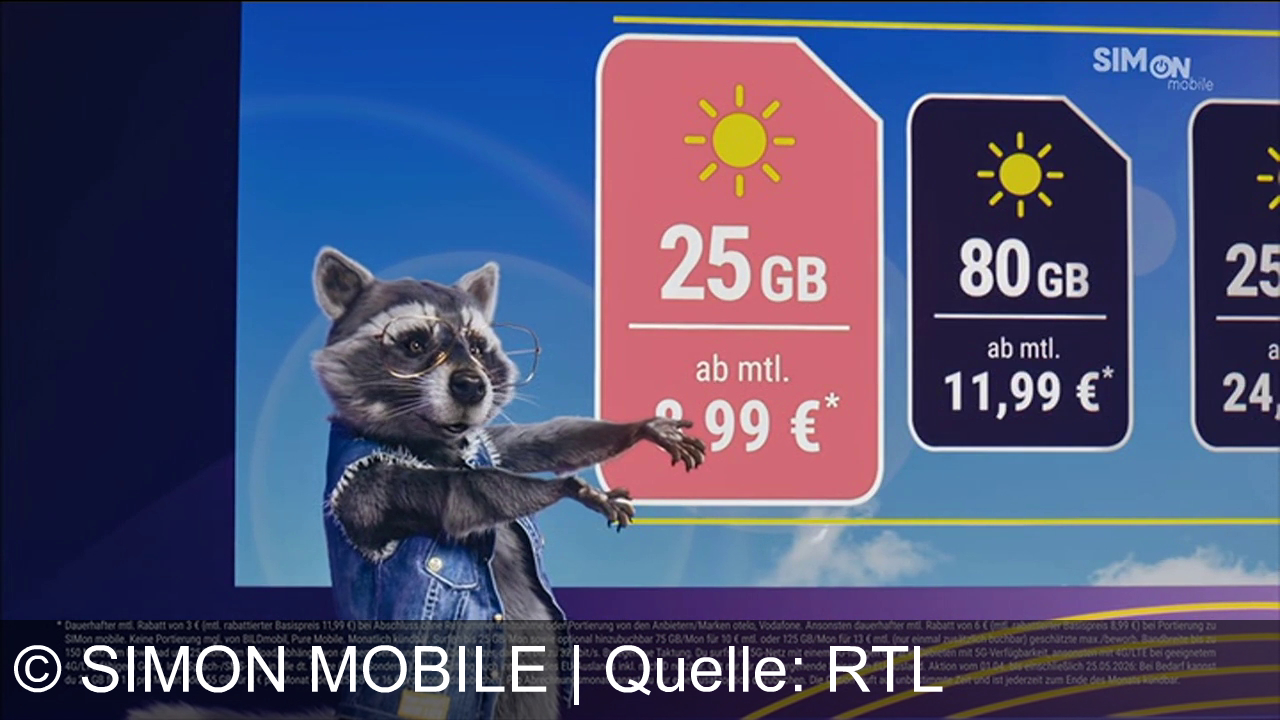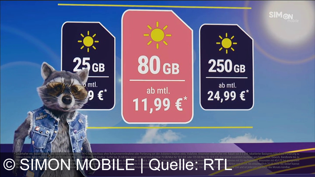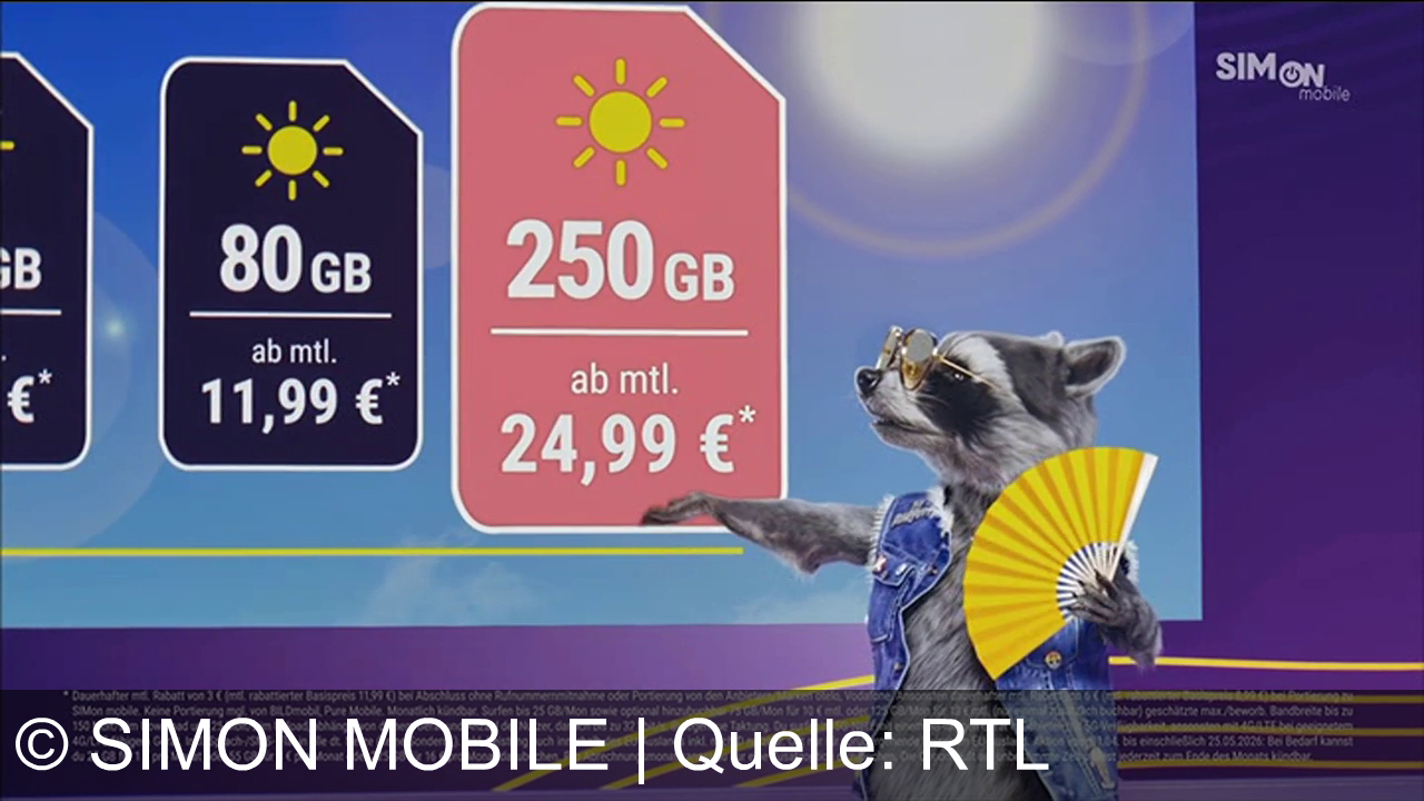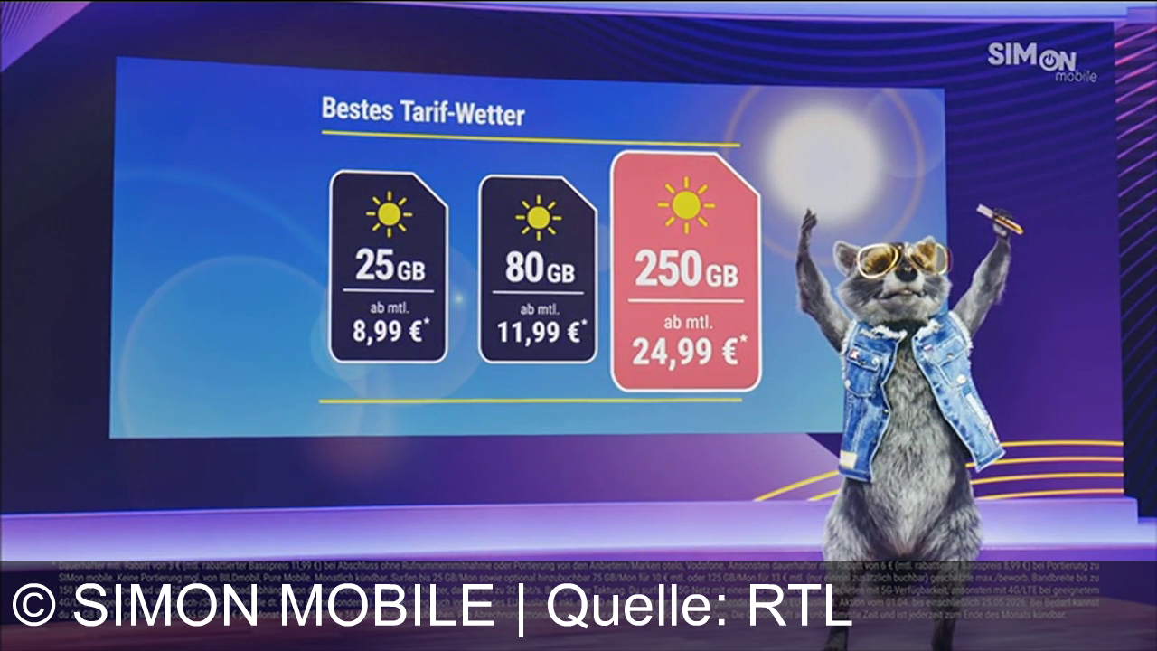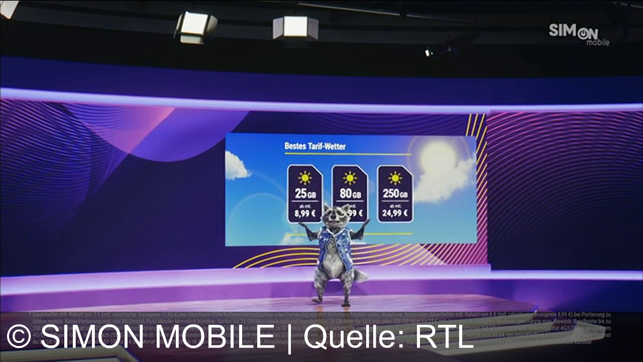 Der TV-Spot von Simon Mobile bewirbt verschiedene Mobilfunktarife, präsentiert von einem animierten Waschbären im Jeansoutfit. Die Angebote reichen von 25 GB für 8,99 Euro über einen 80-GB-Bestseller für 11,99 Euro bis zu 250 GB für 24,99 Euro. Kernbotschaft ist das beste Tarifwetter mit dauerhaft günstigen Preisen, erhältlich auf simonmobile.de.