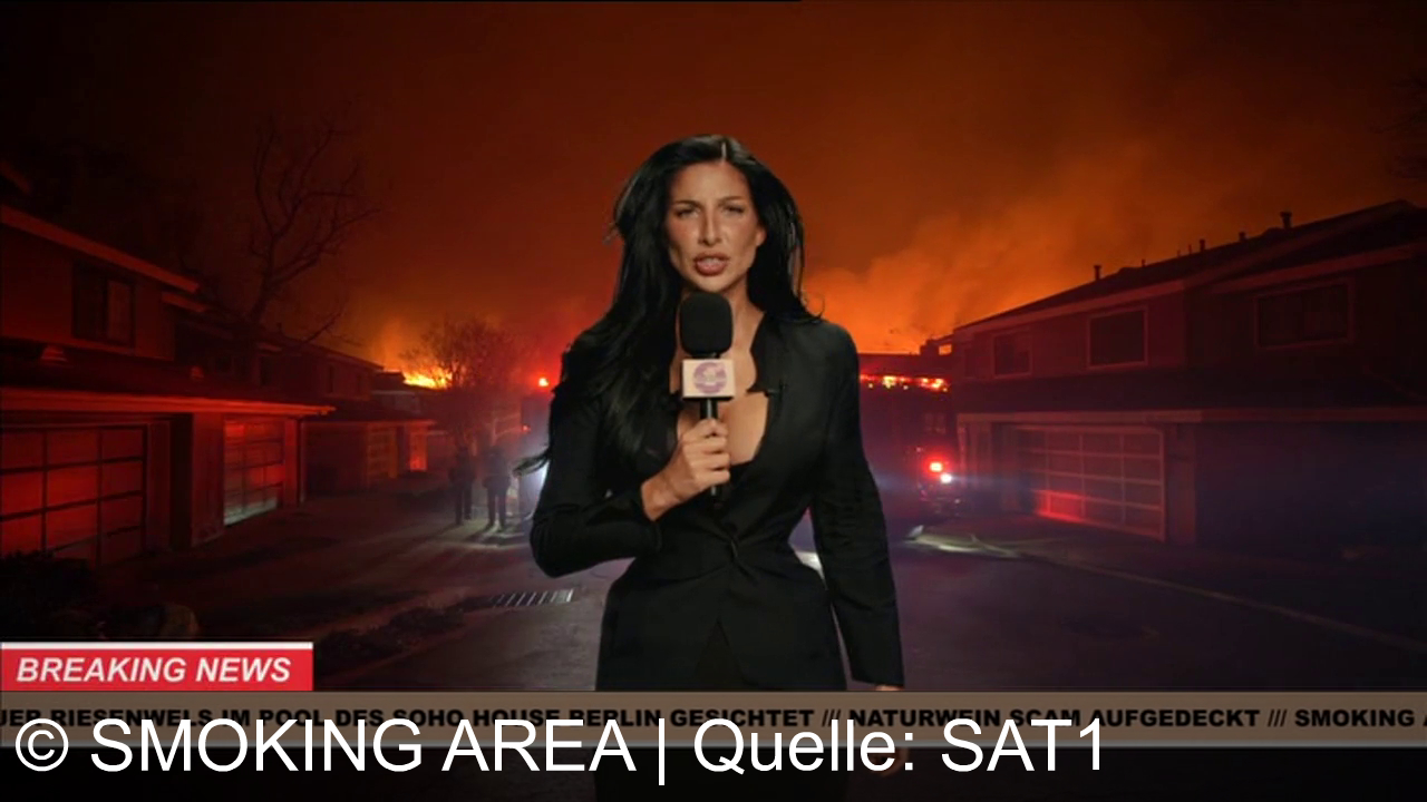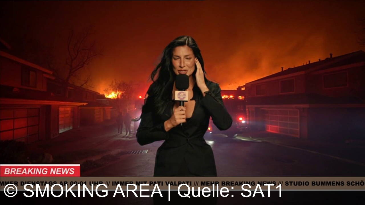 Eine Frau mit schwarzem Haar trägt einen schwarzen Anzug und hält ein Mikrofon. Im Hintergrund brennt es, der Himmel ist orange. Feuerwehrautos und Personen stehen auf der Straße. Unten im Bild läuft ein Nachrichtenband mit verschiedenen Schlagzeilen, darunter "Breaking News".