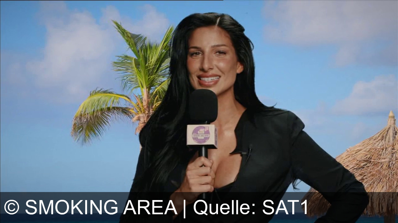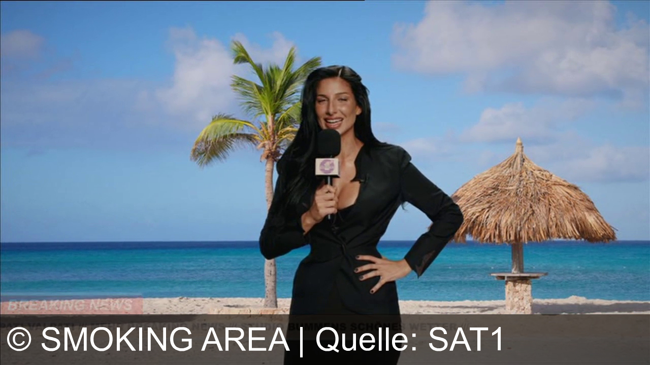 Eine Frau steht am Strand. Sie trägt ein schwarzes Outfit und hält ein Mikrofon. Im Hintergrund sind Meer, Himmel, Palmen und eine Strohhütte zu sehen. Am unteren Bildrand steht „BREAKING NEWS“.