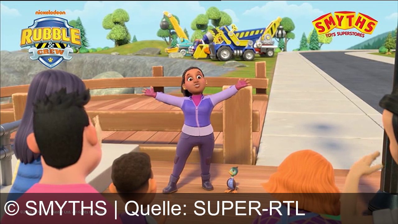 Eine animierte Figur mit offenen Armen steht auf einem Holzsteg. Im Hintergrund ein Baukran. Links oben das Logo „Rubble & Crew“, rechts oben das Logo von „Smyths Toys“. Menschen blicken zur Figur hin. Ein kleiner Vogel steht neben der Figur auf dem Steg. Die Szene ist bunt und lebendig.