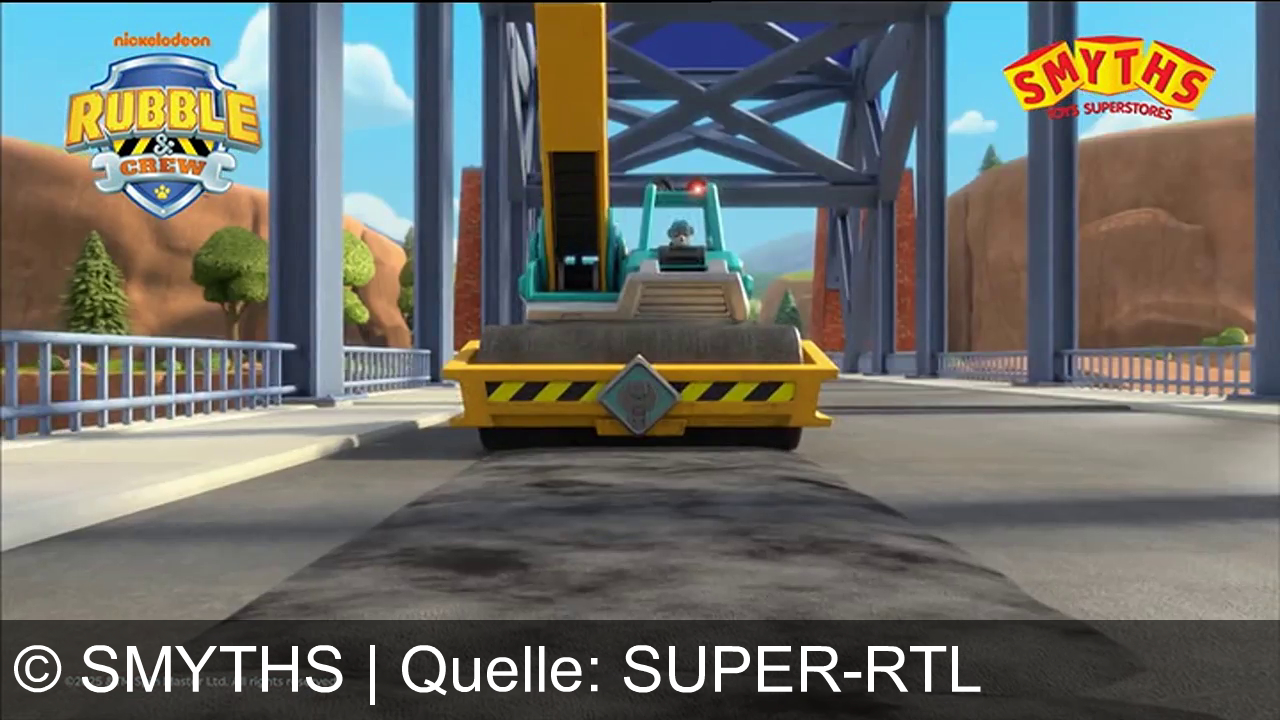 Eine gelbe Straßenwalze fährt über eine Brücke mit blauen Stahlträgern. Links oben ist ein Logo mit der Aufschrift "Rubble & Crew". Rechts oben steht "Smyths Toys Superstores". Im Hintergrund sind Hügel, Bäume und ein blauer Himmel mit Wolken zu sehen. Ein animierter Hund sitzt im Fahrerhaus der Walze.