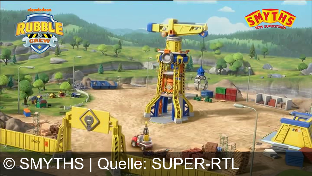 Eine bunte Baustelle mit gelbem Kran, Containern und Sand. Im Hintergrund grüne Hügel und Bäume. Oben links das Logo "Rubble & Crew", oben rechts "SMYTHS Toys Superstores". Links unten Text von Spin Master Ltd. Rechteckige, gelbe Bauzäune umgeben das Gelände. Ein Fahrzeug transportiert Baumaterialien.