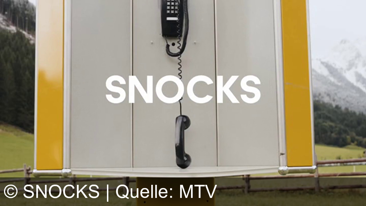 Ein graues Telefon hängt an einer gelben Wand, darunter der Hörer. Der Schriftzug "SNOCKS" ist in Weiß auf der Wand. Im Hintergrund sind Wiesen, Bäume und schneebedeckte Berge.