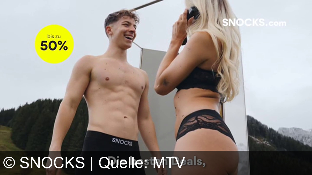 Ein Mann und eine Frau in Unterwäsche stehen draußen in einer bergigen Landschaft. Der Mann lacht, die Frau hält ein Smartphone ans Ohr. Text im Bild: "Die besten Deals, bis zu 50%". Oben rechts steht "SNOCKS.com".