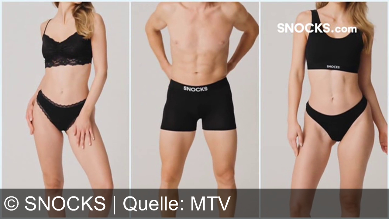 Drei Personen stehen in Unterwäsche vor einem hellen Hintergrund. Links und rechts tragen Frauen schwarze Spitzenunterwäsche. In der Mitte ist ein Mann mit schwarzen Boxershorts. Oben rechts steht "SNOCKS.com".