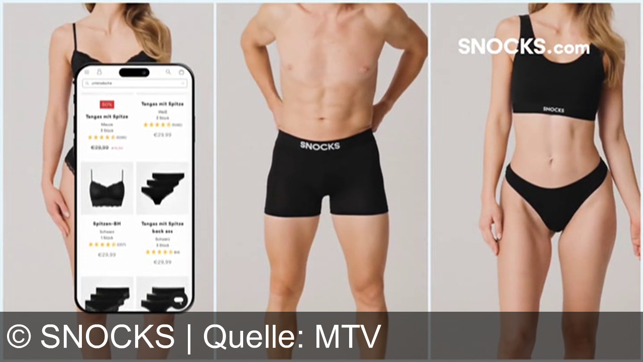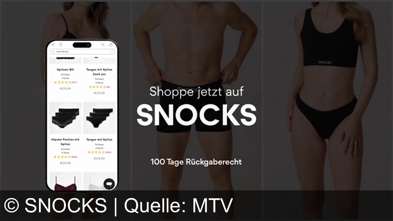 Ein Smartphone zeigt eine Unterwäsche-Produktübersicht. Mittig steht „Shoppe jetzt auf SNOCKS“. Links und rechts sind ein Mann und eine Frau in schwarzer Unterwäsche zu sehen. Unten steht „100 Tage Rückgaberecht“.