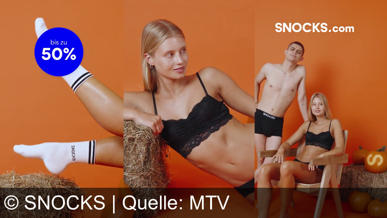 Zwei Personen in Unterwäsche stehen vor einem orangefarbenen Hintergrund. Links eine Frau in schwarzem Spitzen-BH und -Höschen. Rechts ein Mann mit verschränkten Armen, trägt schwarze Unterwäsche. Ein blauer Kreis mit "bis zu 50%" und die Webseite "SNOCKS.com" sind zu sehen.