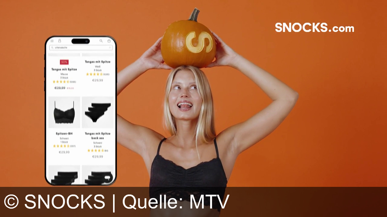 Eine Frau mit blonden Haaren trägt ein schwarzes Spitzentop. Sie hält einen Kürbis mit einem "S" über dem Kopf und streckt die Zunge heraus. Links im Bild ist ein Smartphone, auf dem eine Online-Shop-Seite für Unterwäsche angezeigt wird. Der Hintergrund ist orange, oben rechts steht "SNOCKS.com".
