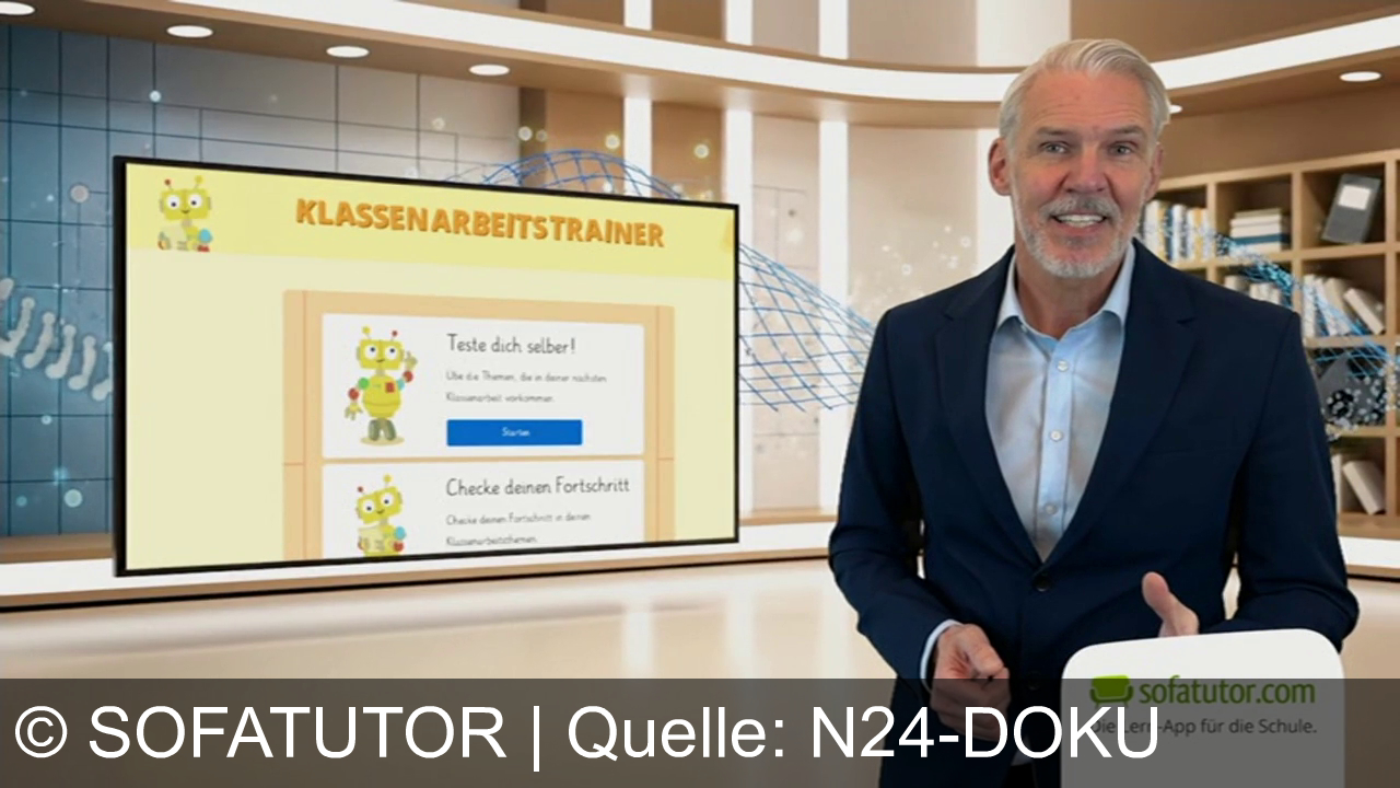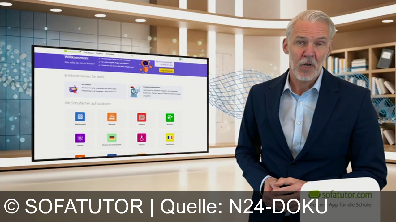 Ein Mann im Anzug steht in einer modernen Umgebung. Im Hintergrund ein großer Bildschirm mit der Website von Sofatutor. Der Raum hat Bücherregale und dekorative Elemente. Oben rechts ist das Logo von Sofatutor.com zu sehen.