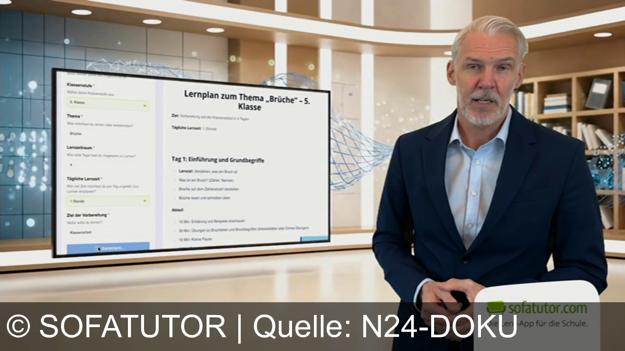 Ein Mann im Anzug steht in einem modernen Raum. Hinter ihm ein großes Display mit einem Lernplan für das Thema "Brüche“ für die 5. Klasse. Rechts unten ein Logo von "sofatutor.com" mit dem Slogan "Die Lern-App für die Schule". Im Hintergrund sind Regale mit Büchern und ein dekoratives Muster an der Wand zu sehen.