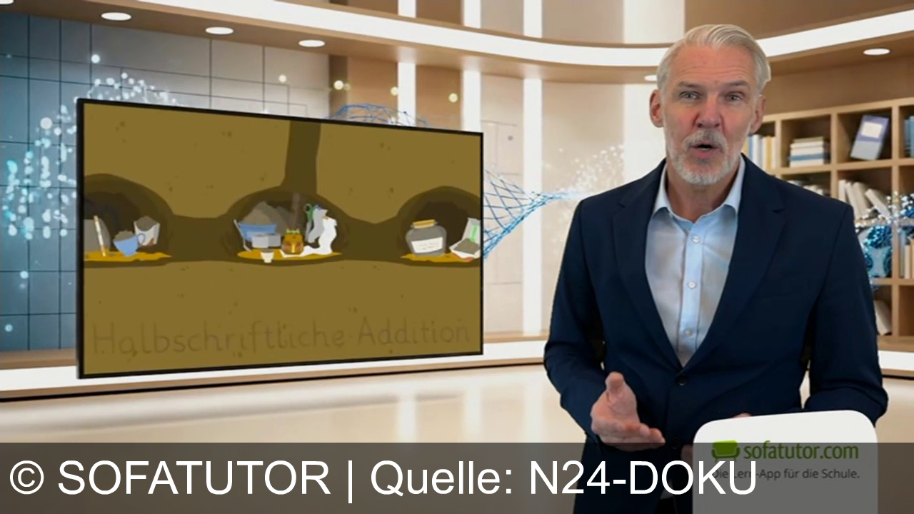Ein Mann im Anzug steht in einem modernen Raum mit einem großen Bildschirm im Hintergrund. Auf dem Bildschirm ist eine Zeichnung mit Tieren und Gegenständen, betitelt mit "Halbschriftliche Addition". Unten rechts ist ein Logo von "sofatutor.com" mit dem Slogan "Die Lern-App für die Schule".