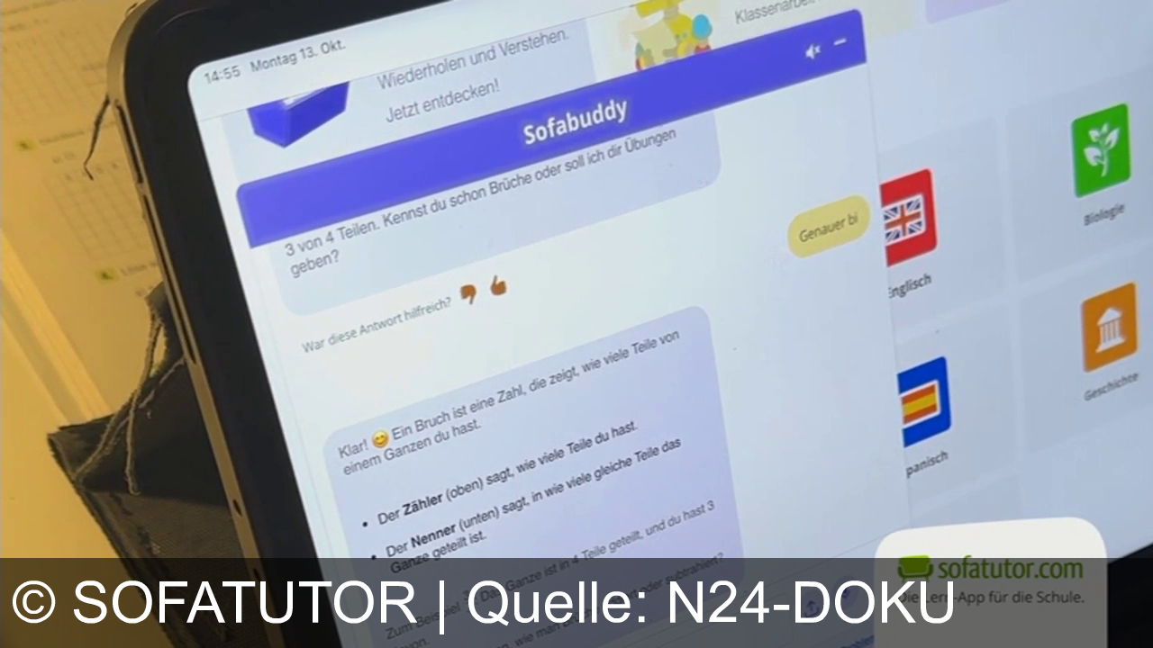 Ein Tablet zeigt eine App mit einem Chatfenster namens "Sofabuddy". Es geht um Brüche, mit Text und Emojis. Rechts sind Fächer wie Englisch, Biologie und Geschichte gelistet. Unten rechts das Logo von sofatutor.com, einer Lern-App, mit einem grünen Sofa-Symbol. Das Datum oben links ist der 13. Oktober, Uhrzeit 14:55.