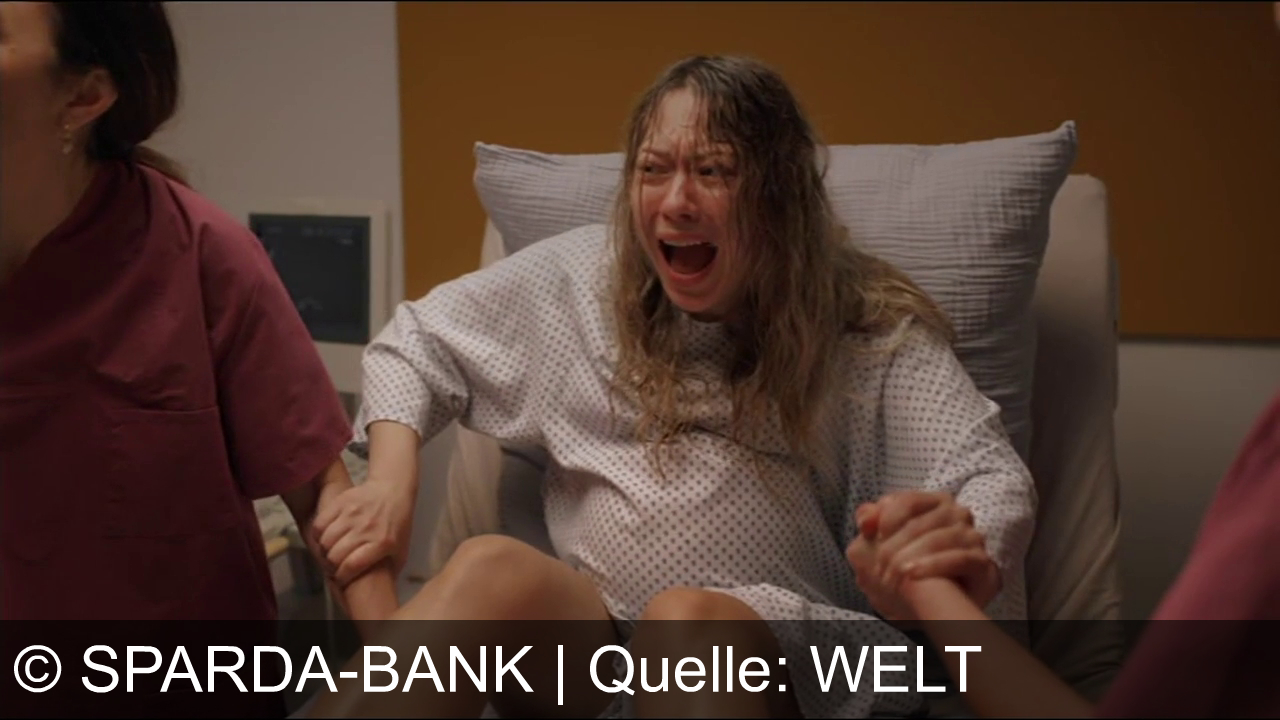 Eine Frau liegt im Krankenhausbett, schreit vor Schmerzen und hält zwei Helfern die Hände. Sie trägt ein Krankenhaushemd, sitzt nach vorn gebeugt und presst, während zwei Personen in medizinischer Kleidung sie stützen.