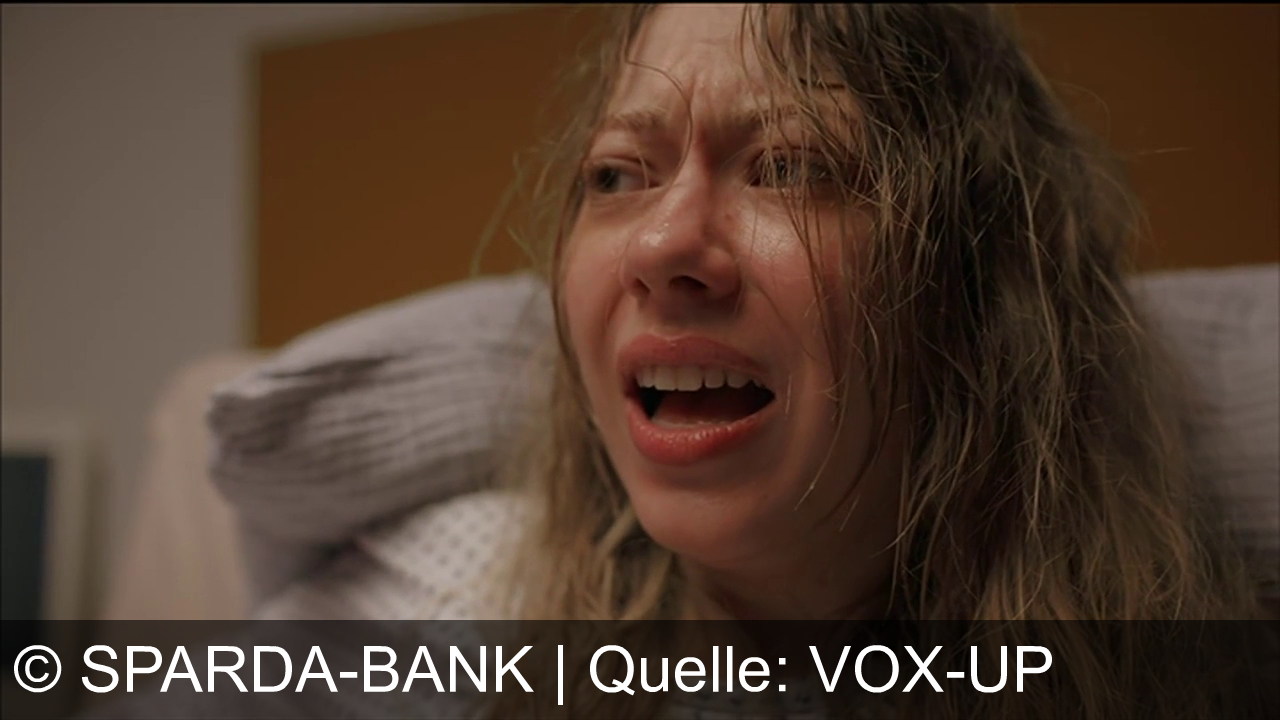 Eine Frau mit nassen Haaren und einem weißen Krankenhauskittel ist zu sehen. Ihr Gesichtsausdruck wirkt angespannt und sie hat den Mund leicht geöffnet. Im Hintergrund ist ein verschwommener Monitor erkennbar.