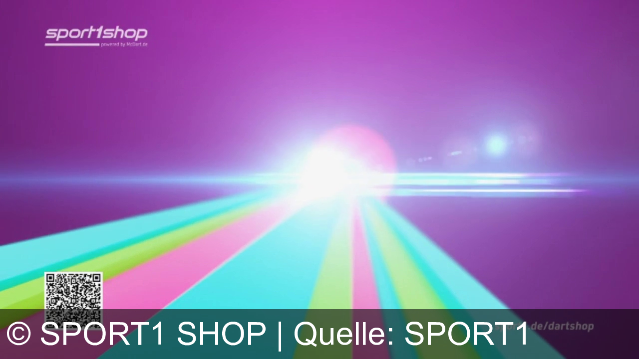 Ein lila Hintergrund mit bunten Strahlen und einem hellen Licht in der Mitte. Oben links steht "sport1shop powered by 11teamsports.de". Unten rechts "sport1.de/dartshop". Ein QR-Code ist unten links sichtbar.