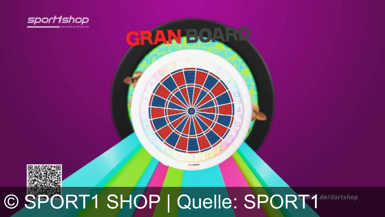 Eine Dartscheibe steht zentral vor buntem Hintergrund. Oben steht "GRAN BOARD" in Rot und Schwarz. Links ist ein QR-Code, unten rechts der Schriftzug "sport1.de/dartshop". Farbig leuchtende Streifen strahlen von der Mitte in Richtung Betrachter. Oben links das Logo "sport1shop powered by McDart.de".