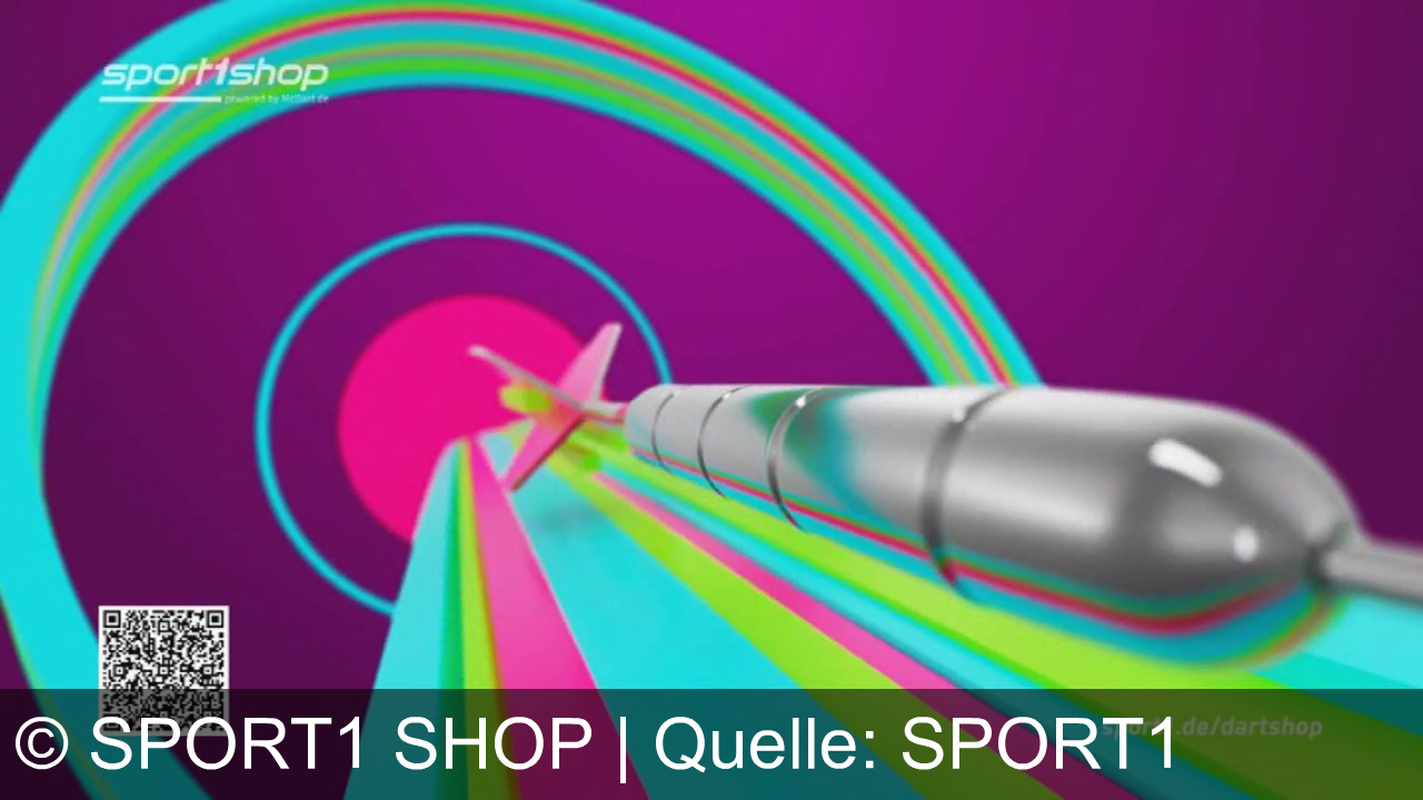 Ein silberner Dartpfeil fliegt durch bunte, kreisförmige Linien in einem violetten Hintergrund. Links oben steht "sport1shop", unten rechts eine Website: "sport1.de/dartshop". Links unten ein QR-Code.