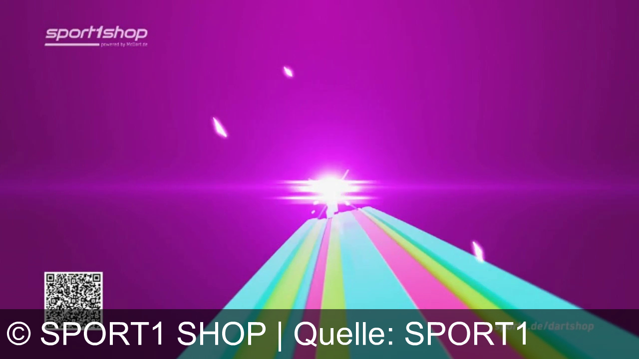 Ein greller Lichtstrahl strahlt aus der Mitte auf einem lila Hintergrund. Bunte, diagonale Linien verlaufen zum Zentrum. Oben links steht "sport1shop", unten links sieht man einen QR-Code. Unten rechts ist "sport1.de/dartshop" zu lesen.