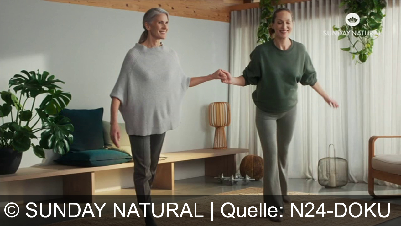 Zwei Frauen halten sich an den Händen und tanzen in einem Wohnzimmer. Die linke Frau trägt einen grauen Pullover und dunkle Hosen, die rechte Frau hat ein grünes Sweatshirt und graue Hosen an. Eine Pflanze steht links, im Hintergrund sind ein Sofa, Kissen und Vorhänge zu sehen. Rechts oben ist das Logo "SUNDAY NATURAL".