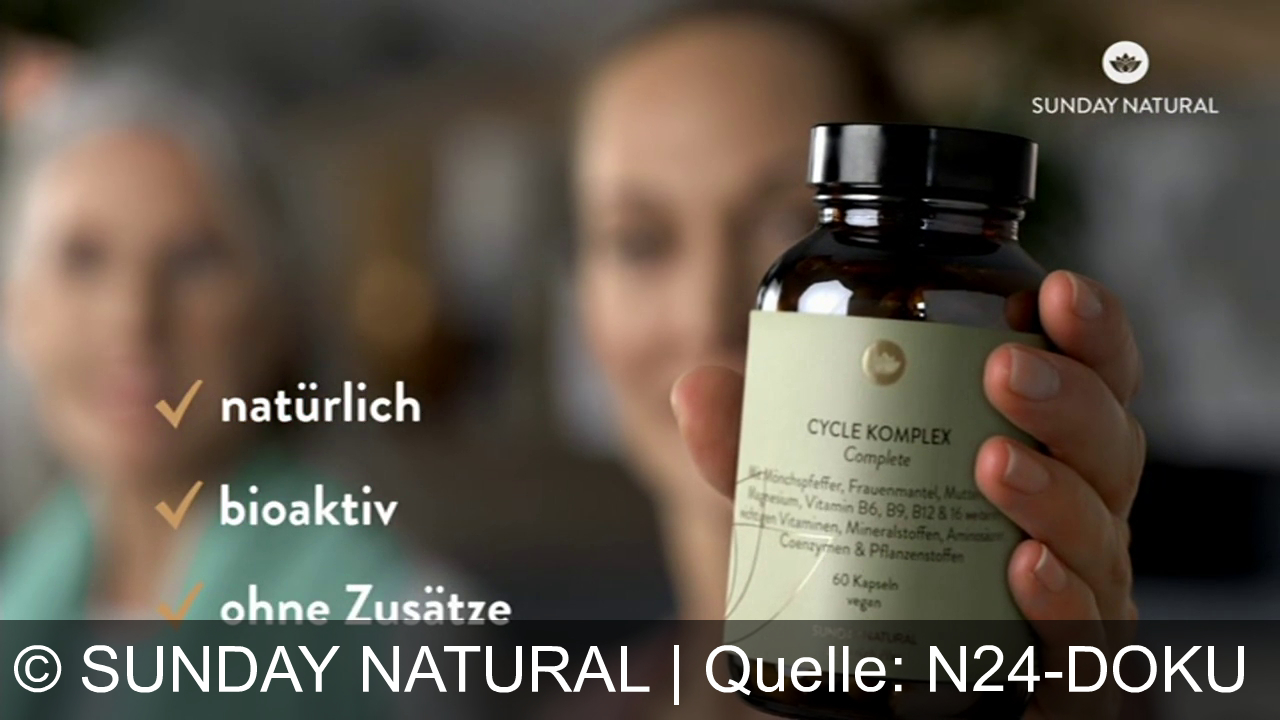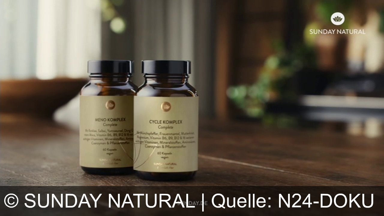Sunday Natural bewirbt die Supplements Meno Komplex und Cycle Komplex – natürliche, bioaktive Produkte zur Unterstützung von hormonellem Gleichgewicht in Zyklus und Wechseljahren, empfohlen von Ärztinnen. Frei von unnötigen Zusätzen, erhältlich auf sunday.de.