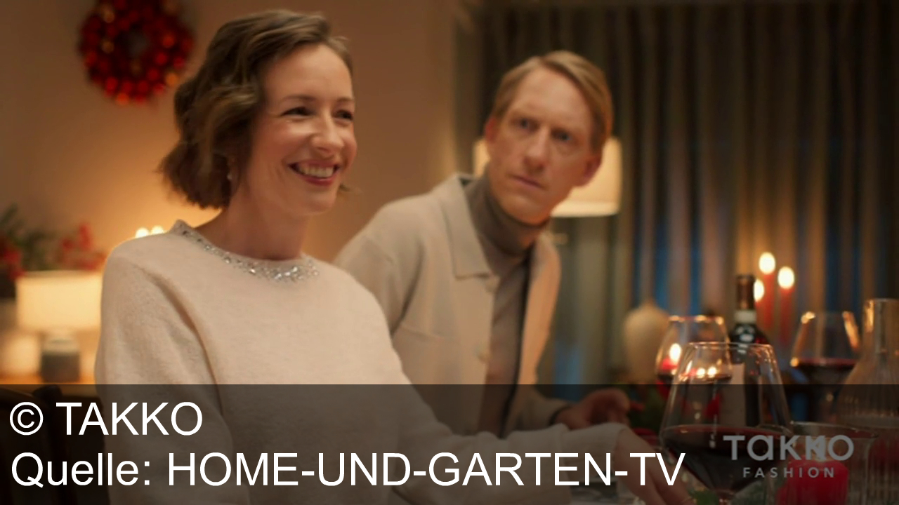 Eine Frau lächelt, sitzt an einem gedeckten Tisch. Neben ihr ein Mann, beide tragen helle Kleidung. Auf dem Tisch stehen Weingläser und eine Weinflasche, im Hintergrund brennen Kerzen. Eine rote Weihnachtskranzdekoration hängt an der Wand. Unten rechts ist das Takko Fashion-Logo zu sehen.
