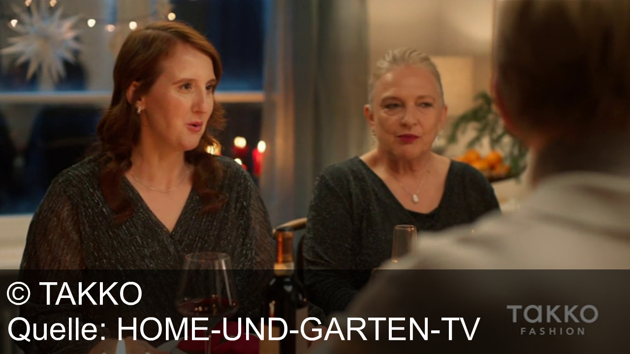 Zwei Frauen sitzen an einem festlich gedeckten Tisch mit Kerzen, einem Glas Rotwein und einer Flasche Wein. Beide tragen dunkle, funkelnde Oberteile. Die Atmosphäre wirkt gemütlich mit Lichterketten und weihnachtlicher Dekoration im Hintergrund. Rechts unten ist das Takko Fashion Logo eingeblendet.
