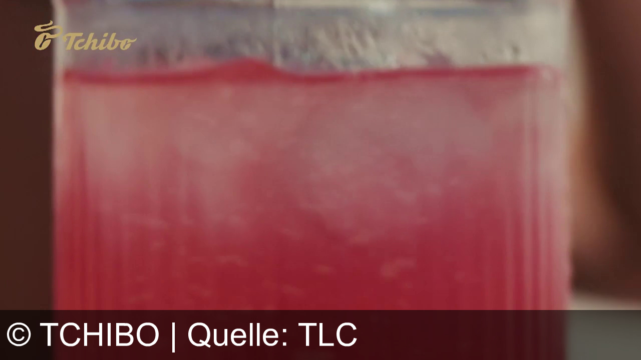 Ein rotes Getränk in einem Glas mit Schaum an der Oberfläche. Links oben das Tchibo-Logo. Rechts eine Hand am Glasrand.