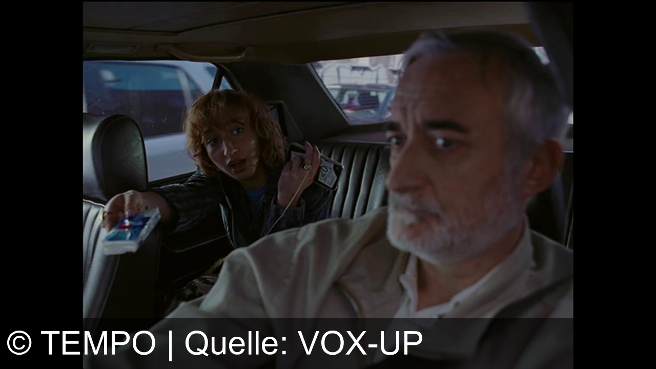 In einem Auto sitzt ein älterer Mann vorne, schaut zur Seite. Auf der Rückbank ist eine junge Person mit einem Walkman, die etwas nach vorne reicht. Draußen sind parkende Autos zu sehen.