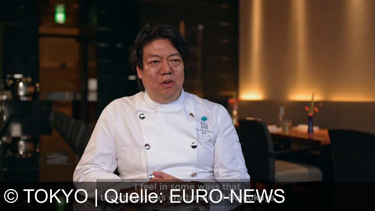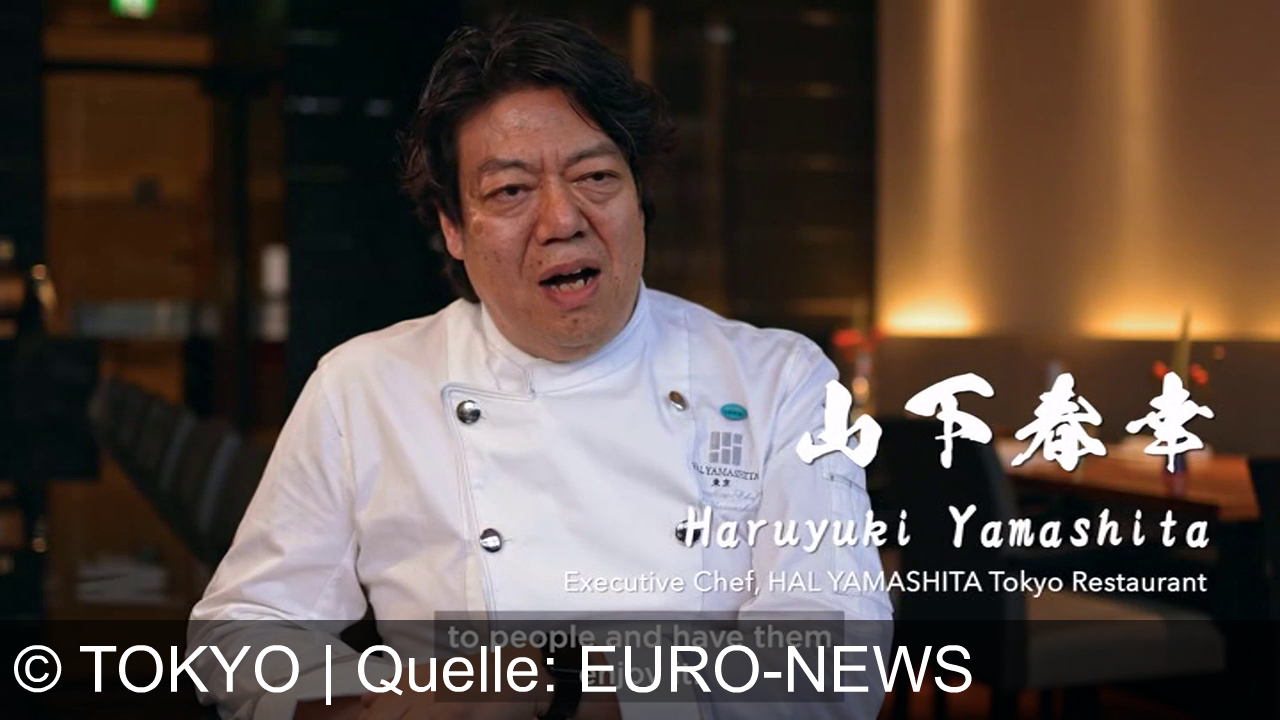 Ein Mann in Chef-Uniform sitzt in einem Raum mit gedämmtem Licht. Neben ihm stehen japanische Schriftzeichen und darunter steht "Haruyuki Yamashita, Executive Chef, HAL YAMASHITA Tokyo Restaurant". Unten läuft ein englischer Untertitel mit: "to people and have them enjoy it". Im Hintergrund sind verschwommene Tische und Stühle zu sehen.